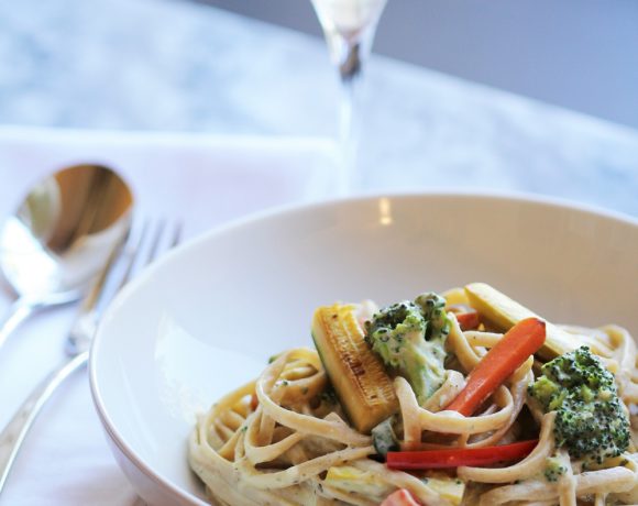 Linguine in Low-Fat Cashew Cream Sauce with Summer Vegetables and Herbs de Provence